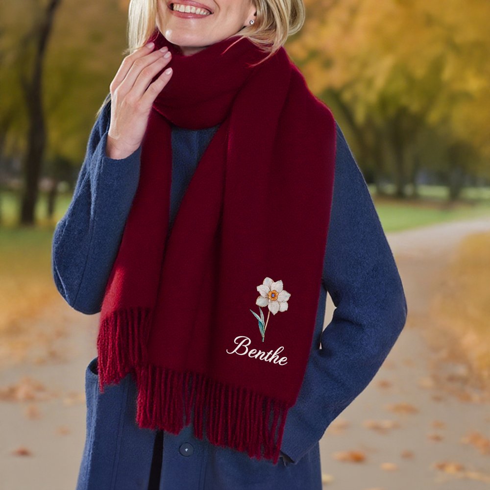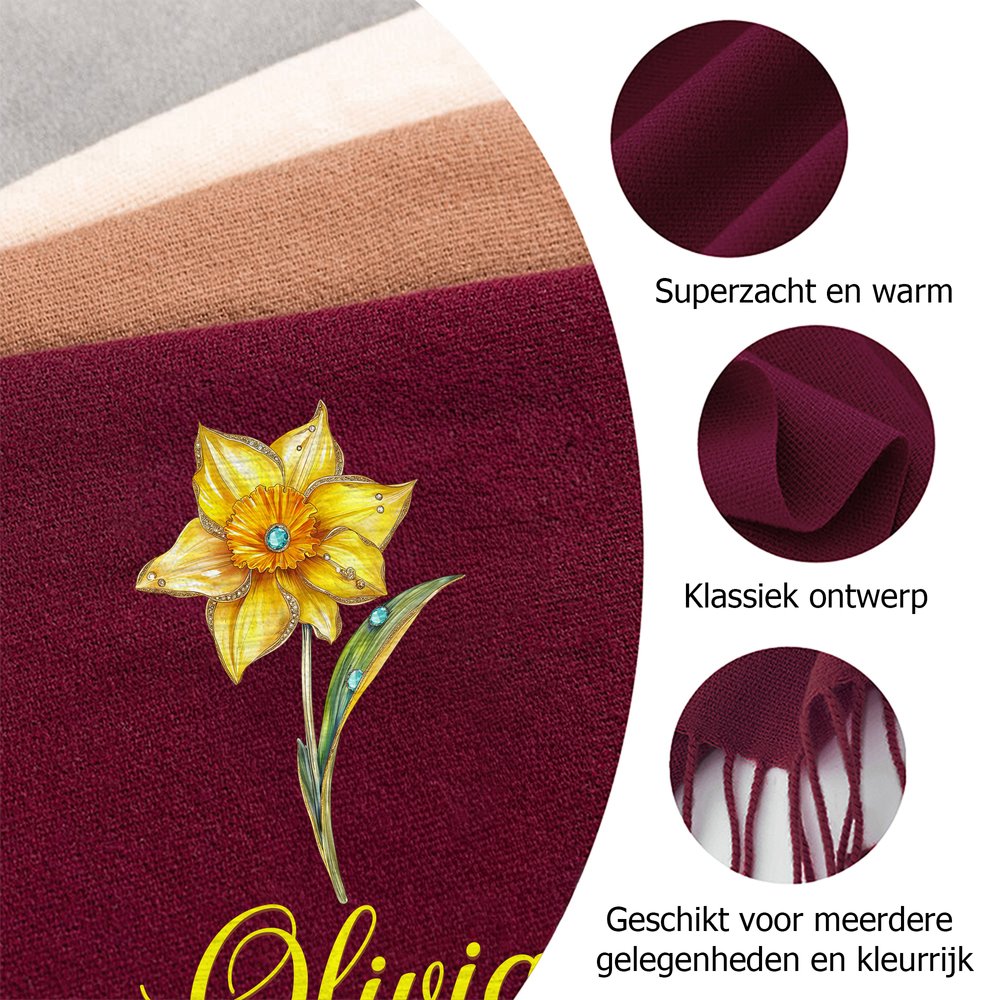 Dit ontwerp met een geboortebloemmotief straalt natuurlijke levendigheid uit en fleurt sobere herfst- en winteroutfits moeiteloos op. De sjaal kan worden gepersonaliseerd met een naam en is verkrijgbaar in acht kleuren en twee praktische maten, waardoor hij eenvoudig te combineren is met diverse kledingstukken. Zo laat de sjaal de prachtige schoonheid van bloemmotieven zien én vormt hij een unieke manier om je persoonlijke stijl te benadrukken.