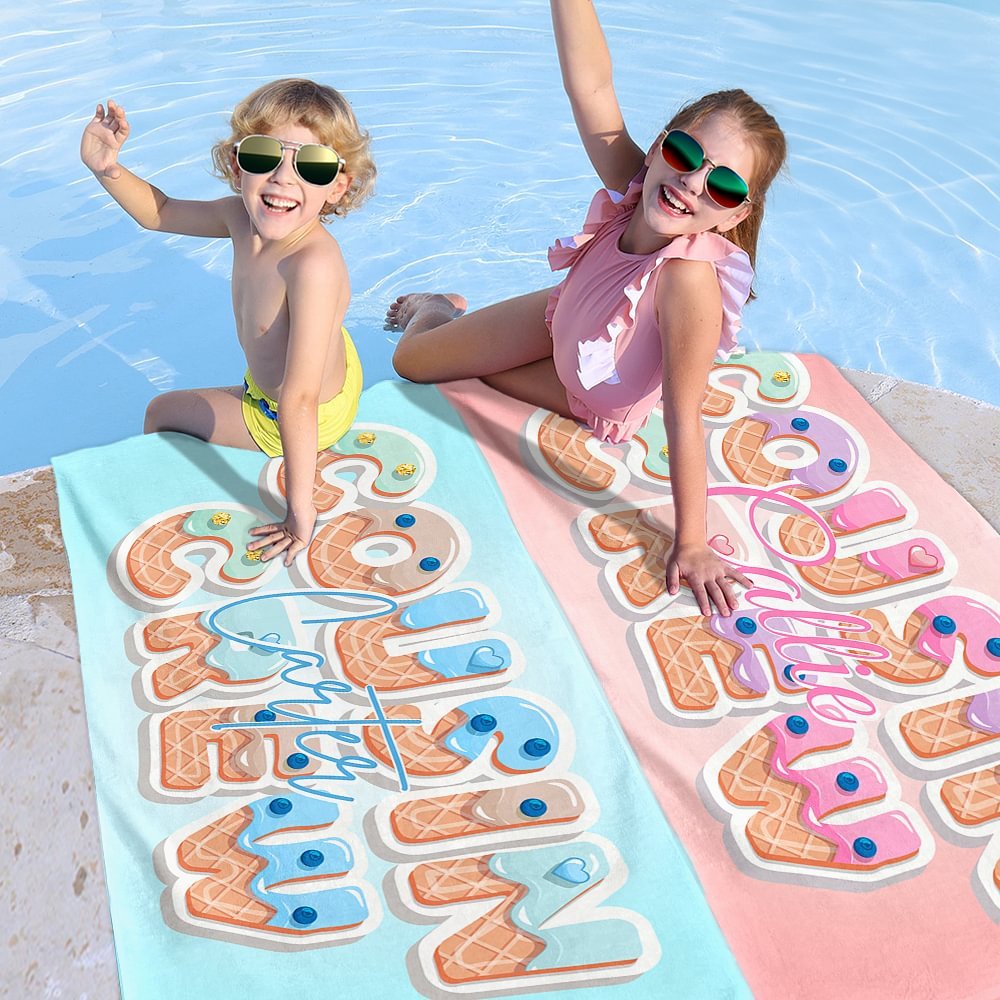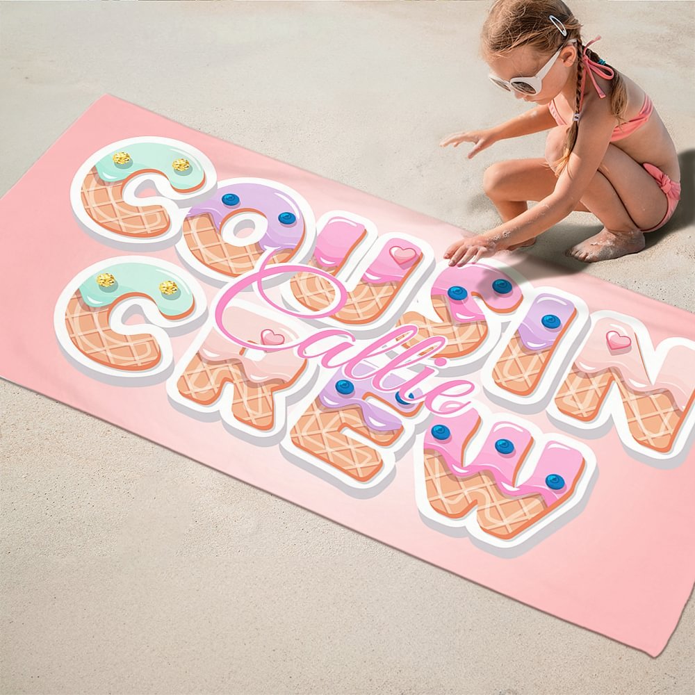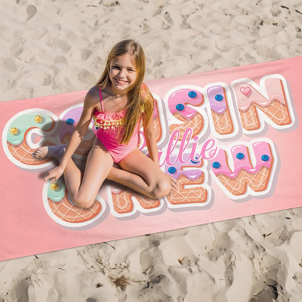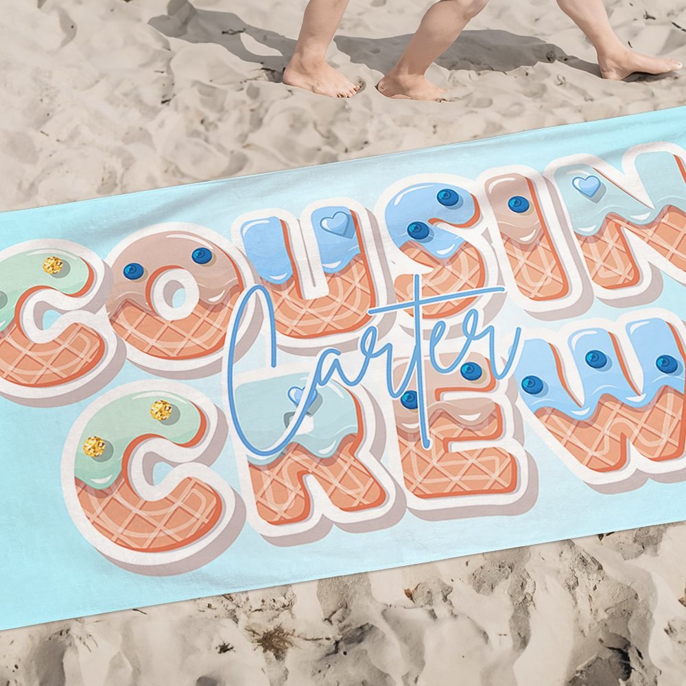 Dit strandlaken heeft een opvallende "cousin crew" slogan als middelpunt, met een schattig en zoet ijsjesontwerp. Je kunt ook je naam erop laten zetten, waardoor het een must-have accessoire voor de zomer wordt.