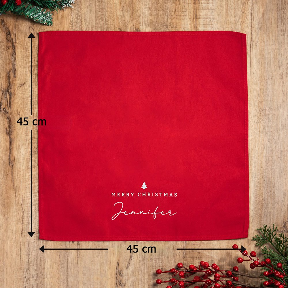 Deze servetten kunnen worden gebruikt om gemorste vloeistoffen weg te vegen of als decoratieve tafelaankleding. Elk servet is bedrukt met de tekst “Merry Christmas”. Maak uw kerstdiner extra bijzonder met gepersonaliseerde servetten waarop u familienamen, namen van familieleden of feestelijke pictogrammen kunt laten aanbrengen. De servetten zijn gemaakt van 100% puur katoen en hebben een feestelijk ontwerp — de perfecte aanvulling op uw kersttafel en andere feestelijke bijeenkomsten.