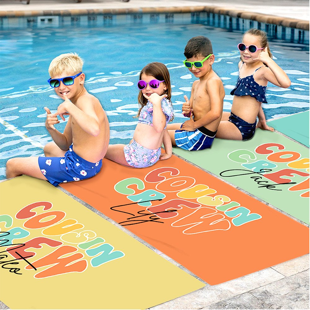 Dit strandlaken heeft als thema "Cousin Crew" en gebruikt een verscheidenheid aan heldere en levendige kleuren. Met de gepersonaliseerde naam kunt u exclusieve zomerspullen maken voor kinderen of familieleden en vrienden, waardoor het een unieke betekenis krijgt. Het unieke ontwerp is niet alleen geschikt voor familie-uitstapjes, maar kan ook een heldere rekwisiet worden voor groepsfoto's, waardoor elke bijeenkomst vol vreugde is.