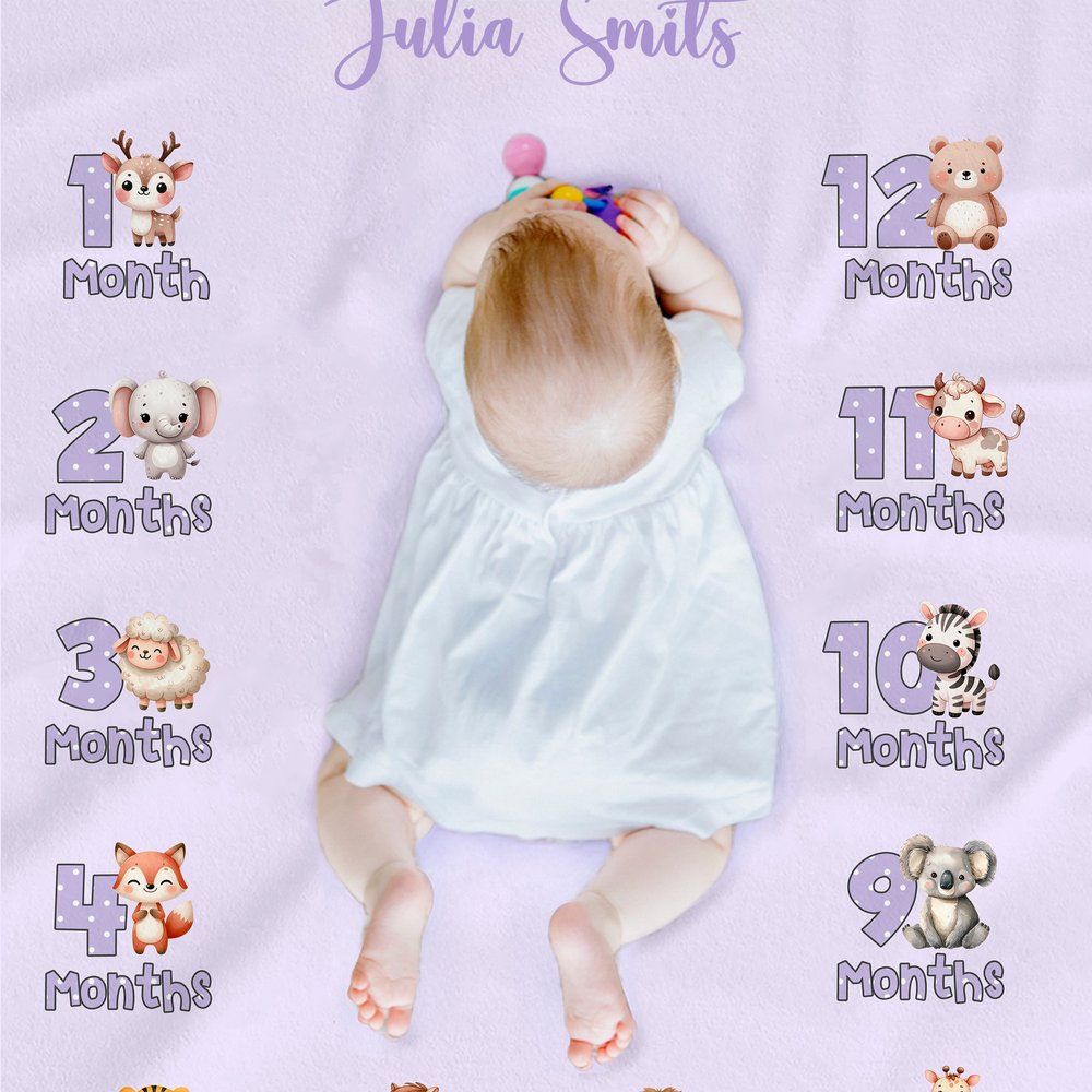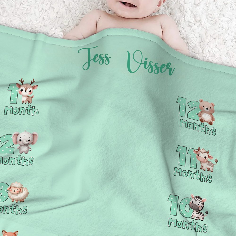 Leg elk kostbaar moment vast met dit maandelijkse mijlpaaldeken met dier-van-de-maand ontwerp, inclusief 12 dieren zoals olifant, vos, tijger en leeuw. Het creëert een warme sfeer en kan ook worden bedrukt met de naam van uw kind, waardoor het een uniek geschenk wordt.