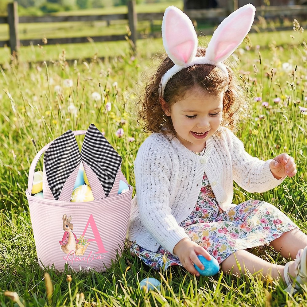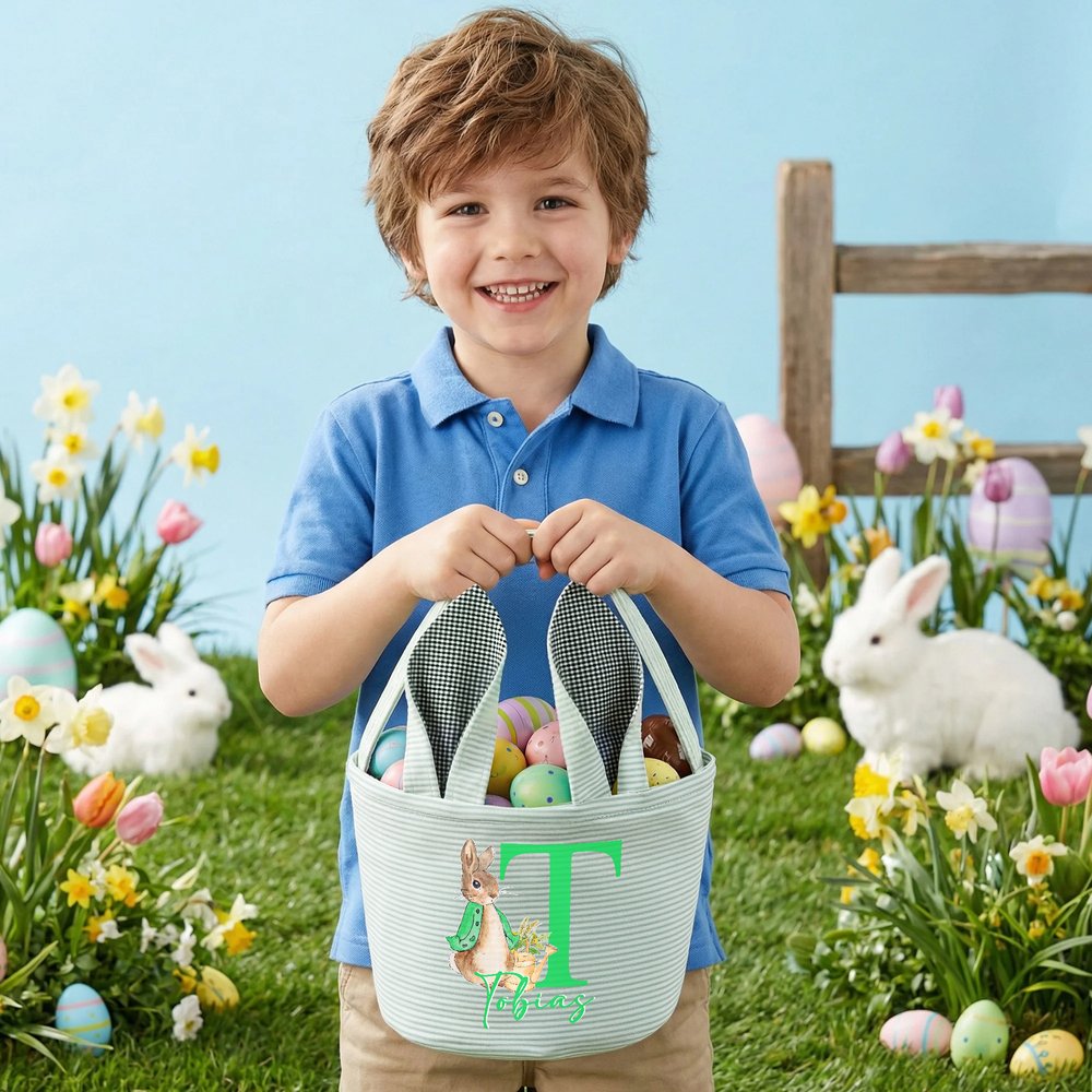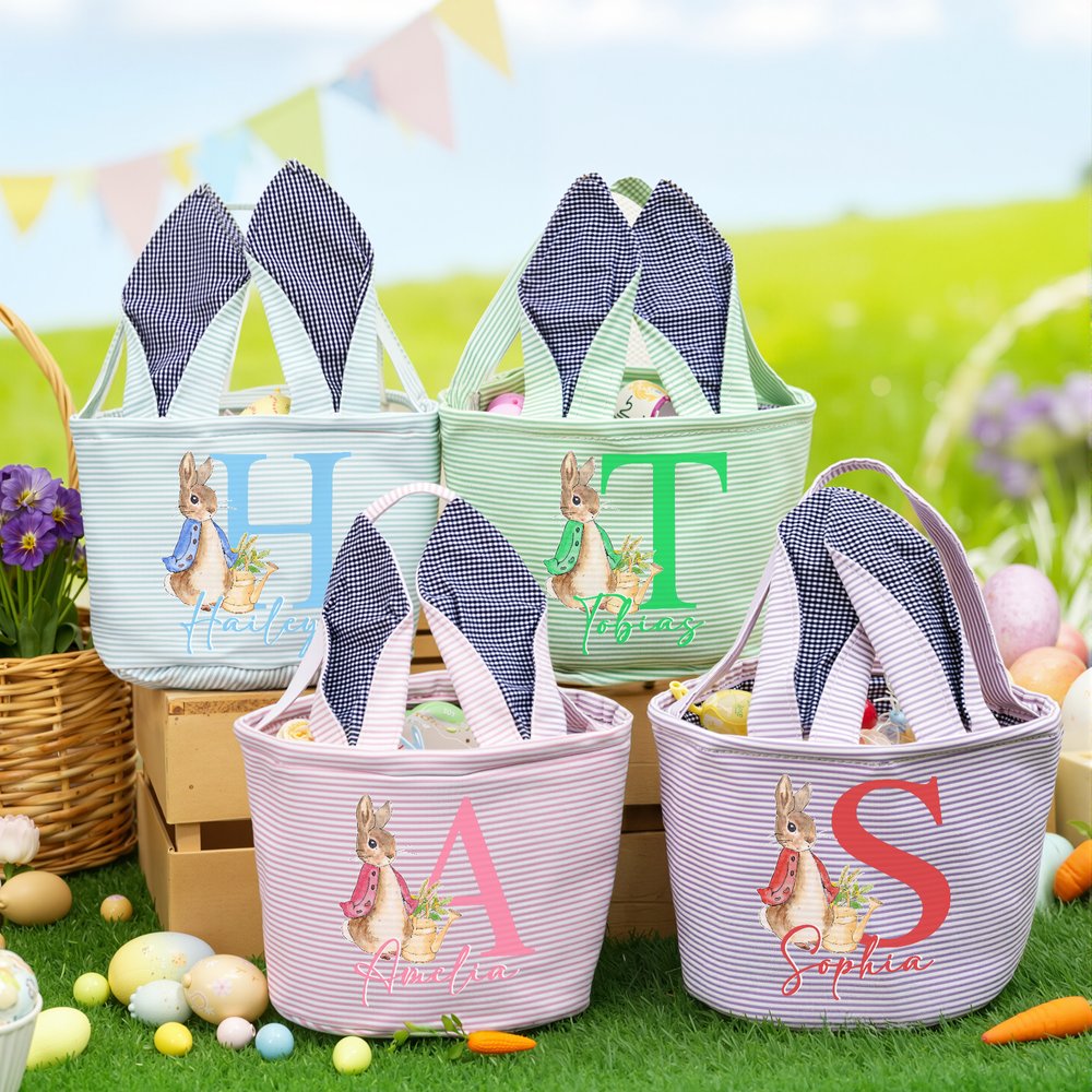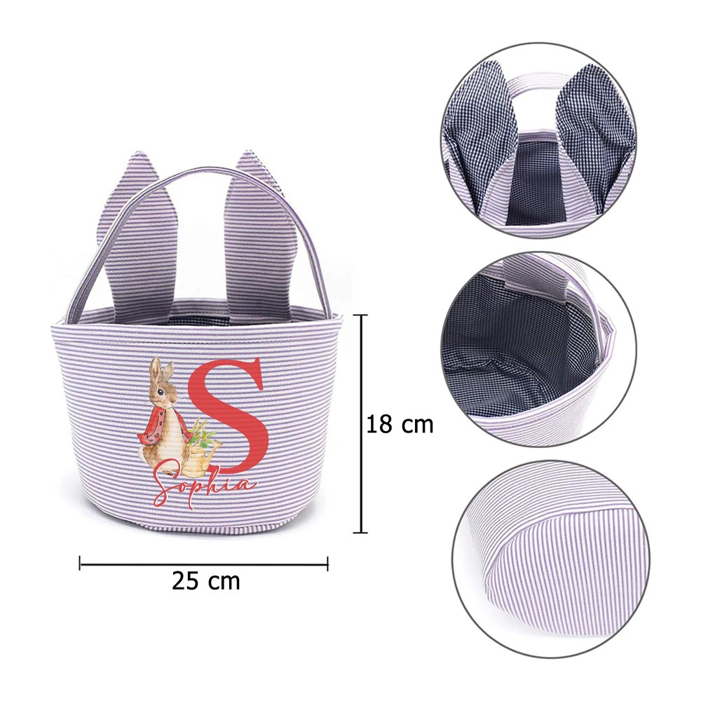 Gepersonaliseerde Schattige Pieter Konijn Paasmand met Oortjes van Gestreept Canvas met Naam en Initiaal voor Eieren Zoeken Paascadeau voor Kinderen