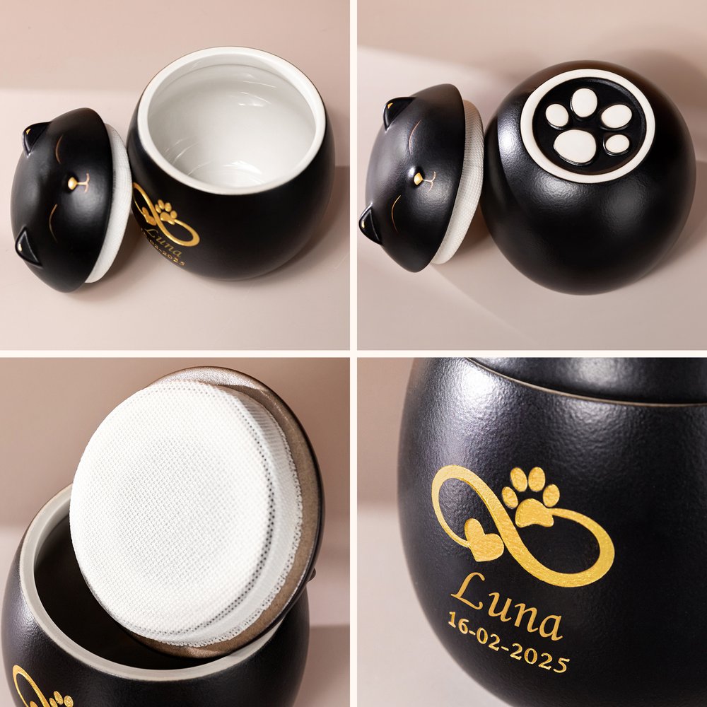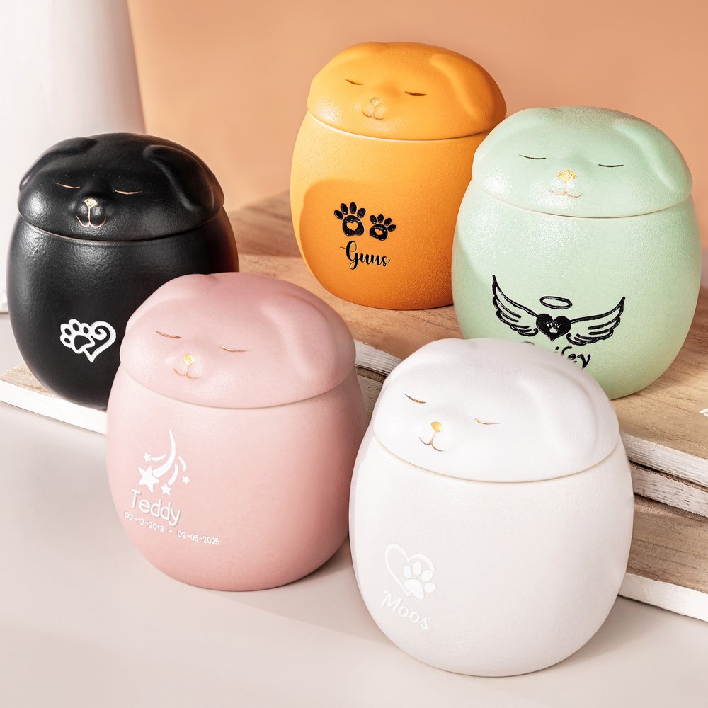 Elke urn is vervaardigd uit hoogwaardig keramiek, met liefdevol vakmanschap gebakken en zorgvuldig afgewerkt, om een blijvend eerbetoon te bieden dat de tand des tijds doorstaat. Of u nu kiest voor een klein of groot formaat, onze urnen combineren duurzaamheid met schoonheid, en vormen een tijdloze, respectvolle rustplaats voor de as van uw dierbare huisdier.
