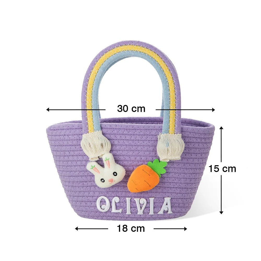 Dit charmante geweven mandje heeft een speels ontwerp met een schattig konijntje en een 3D-worteldecoratie, waardoor het perfect is voor paasvieringen en het zoeken naar paaseieren. Het mandje is verkrijgbaar in zeven prachtige kleuren en biedt een speciale personalisatieoptie: je kunt de naam van je kind toevoegen, waardoor het een bijzonder en blijvend aandenken wordt.