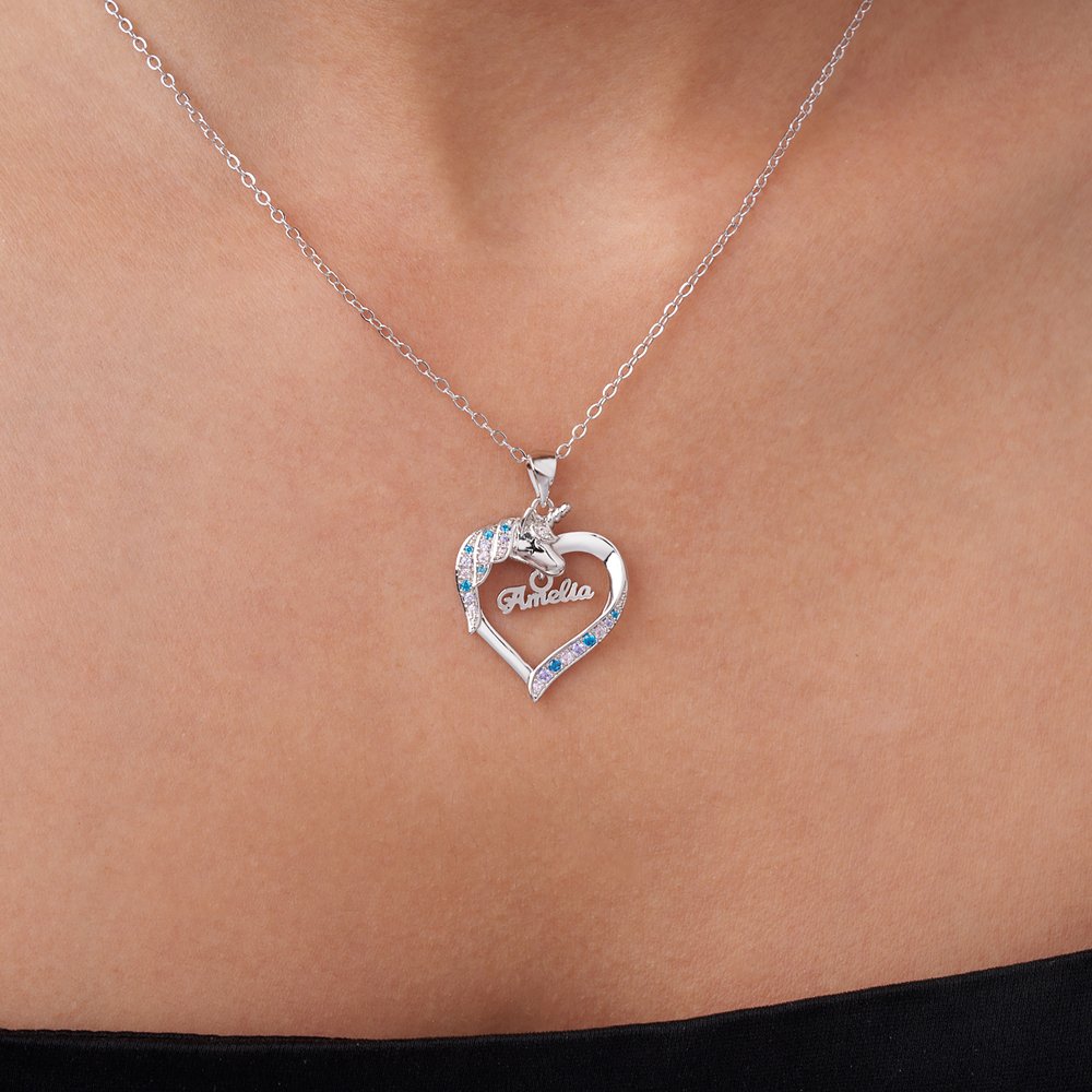 Deze ketting is geïnspireerd op een fantasie-eenhoorn en heeft een hartvormige hanger die kan worden aangepast met een naam. Het grillige bedeltje en de fonkelende zirkonia voegen een extra vleugje charme toe, waardoor het een prachtig accessoire is voor elk jong meisje.