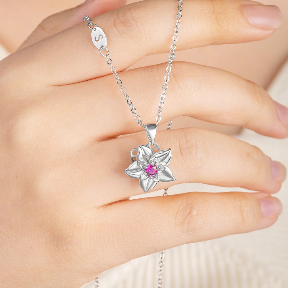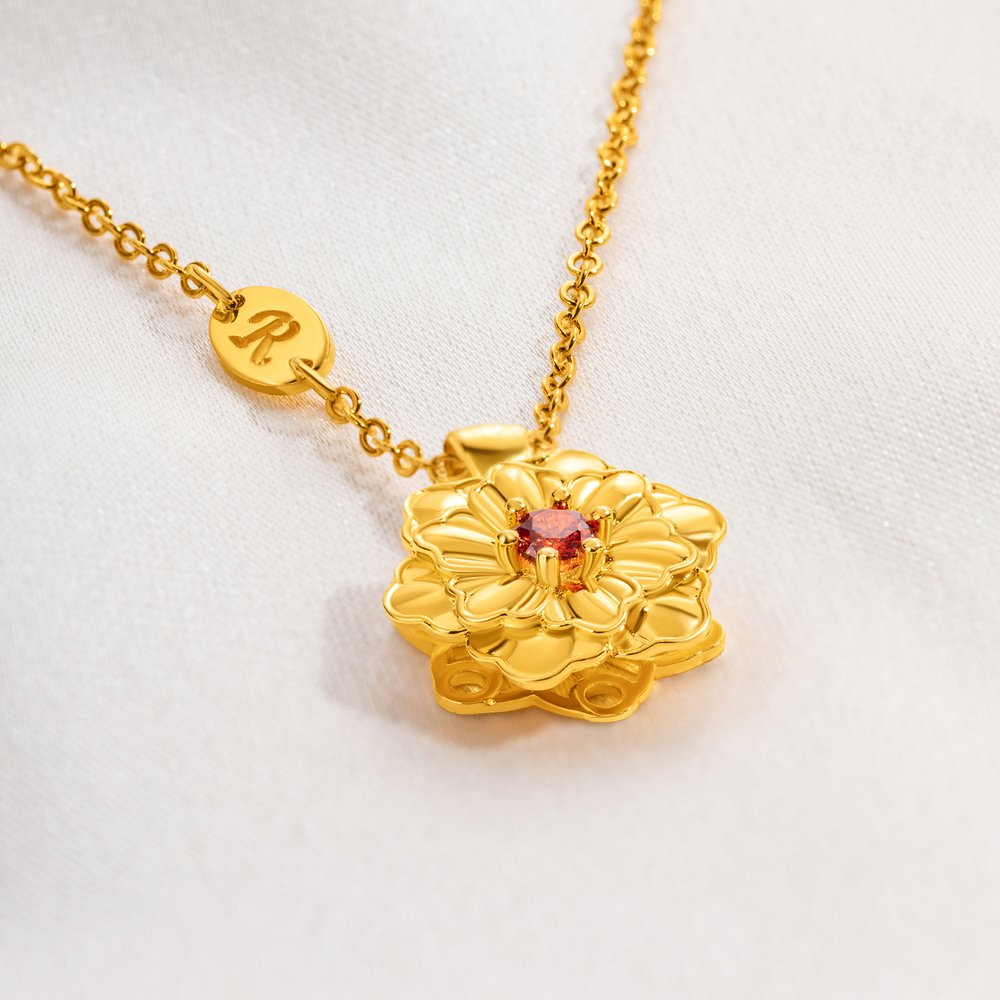 Deze ketting combineert op een slimme manier de geboortebloemen van elke maand met hun bijbehorende geboortestenen. Een natuurlijke edelsteen is in het midden van de bloem gezet en kan worden gecombineerd met een hanger met naaminitialen. De hanger heeft een verborgen, ingewikkelde structuur die sierlijk ronddraait met een zachte aanraking en een vleugje eigenzinnigheid toevoegt aan de drager.