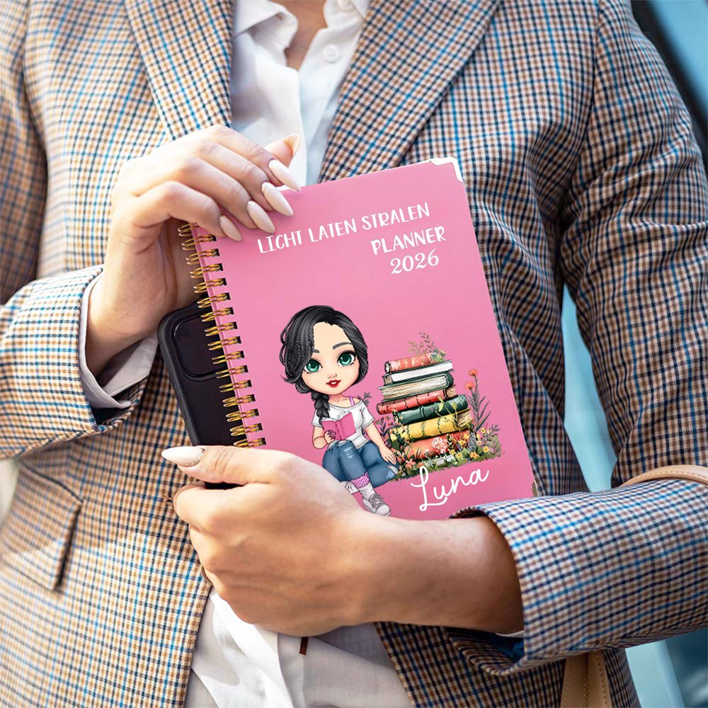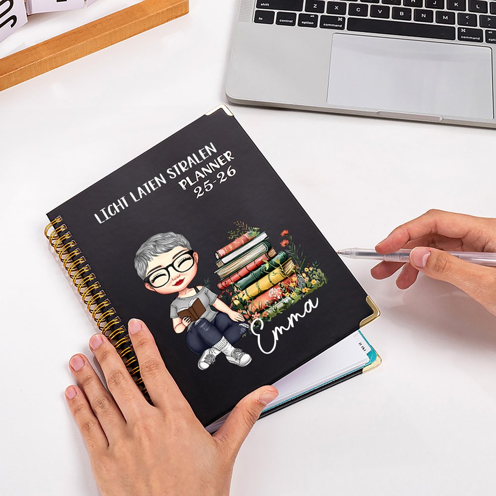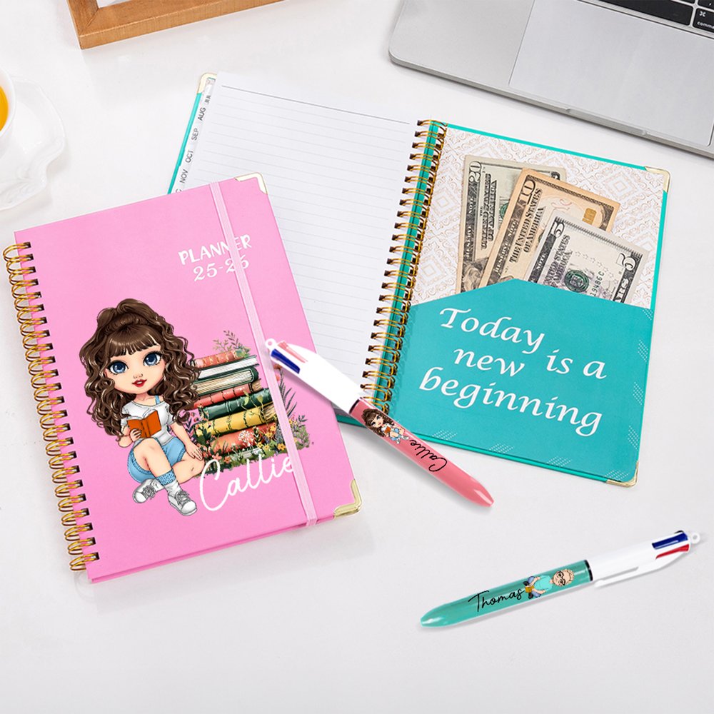 Ons notitieboek met planner heeft vijf kleuren omslag en is bedrukt met schattige stripfiguren. Ongeacht geslacht of leeftijd, je kunt het aanpassen aan je eigen voorstellingen en combineren met elementen zoals boeken en bloemen, die vol kracht en vitaliteit zijn. Je kunt je naam en titel toevoegen om een uniek notitieboek te maken en je charme te tonen.