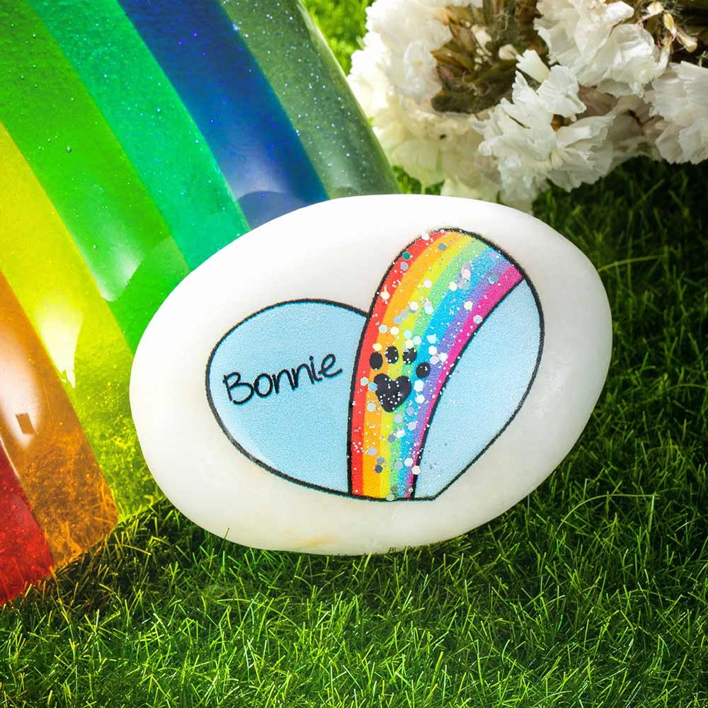 Dit is een steen ter herdenking van het verlies van huisdieren zoals honden, katten etc. Op de steen zit een regenboogbrug, wat een mooie manier is om onze gedachten te uiten. •Hou hem bij je: klein, schattig en mooi, een steentje met positieve energie kan overal mee naartoe worden genomen. De regenboog heeft pailletten en glitters. • Aanpasbaar: de naam van het huisdier kan op de steen worden aangepast om deze uniek te maken. •Perfect cadeau: het is een geweldig cadeau voor iemand die een huisdier heeft verloren. Opmerking: *Deze stenen zijn niet ontworpen voor speelgoed en zijn niet geschikt voor kinderen jonger dan 3 jaar, omdat er verstikkingsgevaar kan bestaan. *Elke kasseien meet ongeveer 60 mm x 40 mm, maar kan variëren in grootte en vorm.