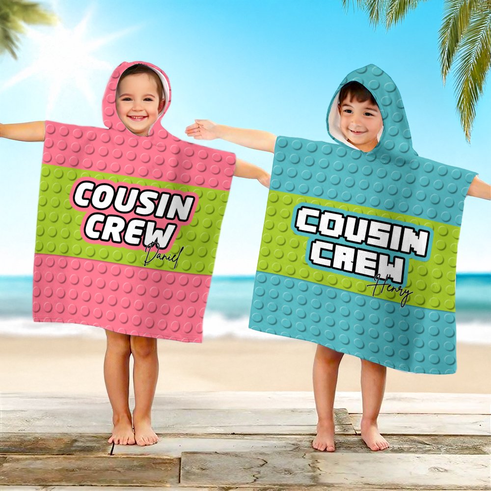 Dit oversized strandlaken met capuchon kan gepersonaliseerd worden met de naam van een kind en voegt een leuke, speelse noot toe aan de stranddag of zwembadervaring van uw kind. Het heeft 19 kleuren strandlaken, grappige gepixelde speelgoedbouwstenen en een ontwerp met de titel "neef en nicht".