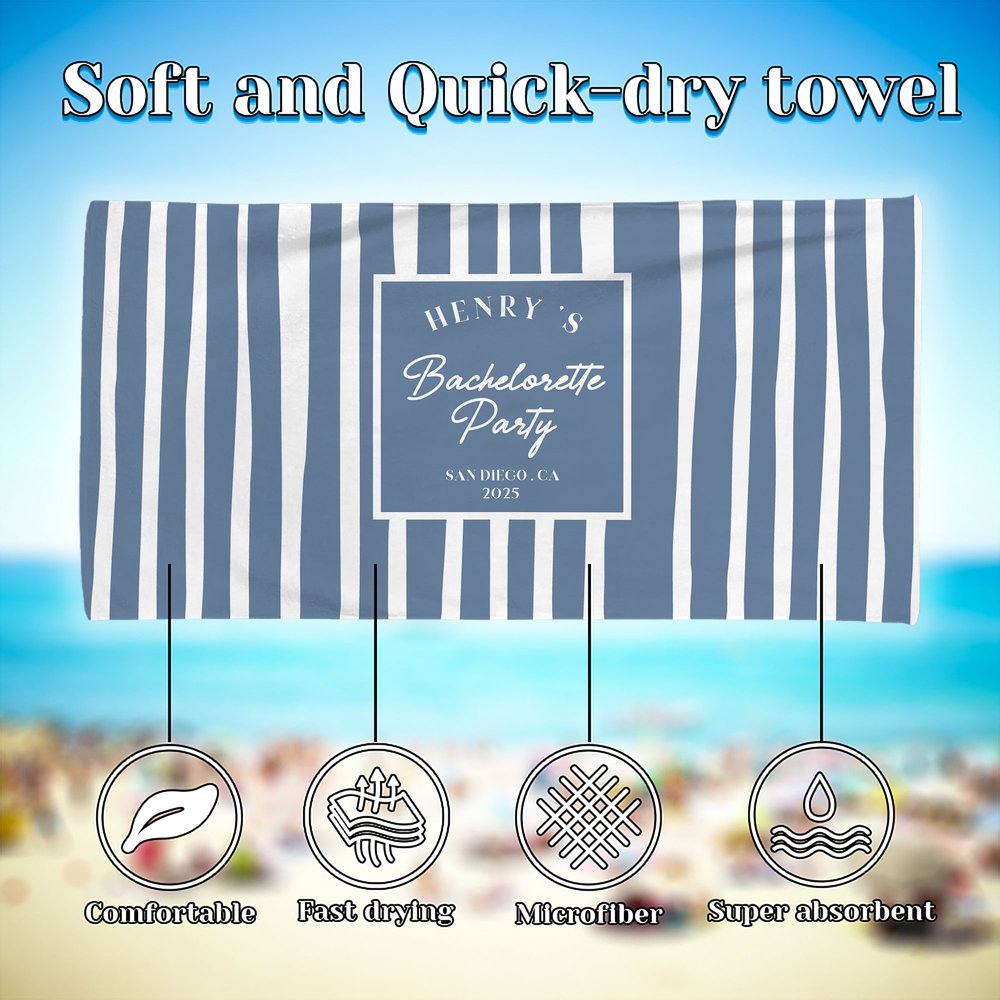 Dit is een gepersonaliseerd strandlaken voor een vrijgezellenfeest aan zee. Het heeft een stijlvol en modern gestreept geometrisch patroon. Wat nog specialer is, is dat dit strandlaken naam, tijd en locatie kan aanpassen, waardoor dit cadeau uniek is en uw oprechtheid en zorg toont.