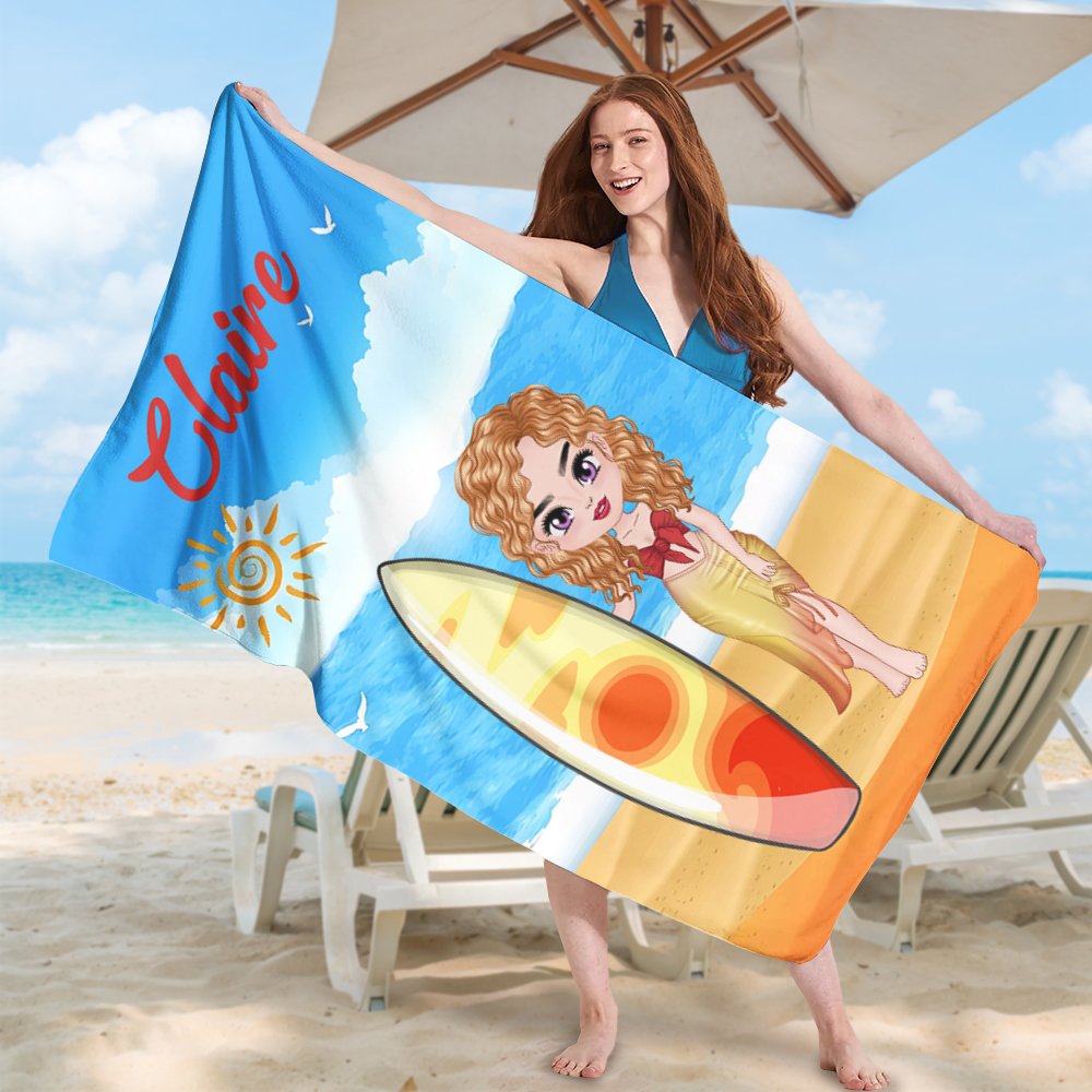 Dit strandlaken is volledig te personaliseren: laat uw naam, een stripfiguur en surfplankdetails naar wens bedrukken. Verkrijgbaar in twee formaten, is dit strandlaken een echte blikvanger die perfect aansluit bij uw persoonlijke stijl. Ideaal voor op het strand, bij het zwembad of tijdens een zonnige vakantie.