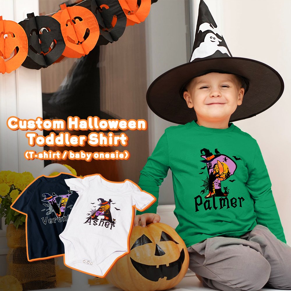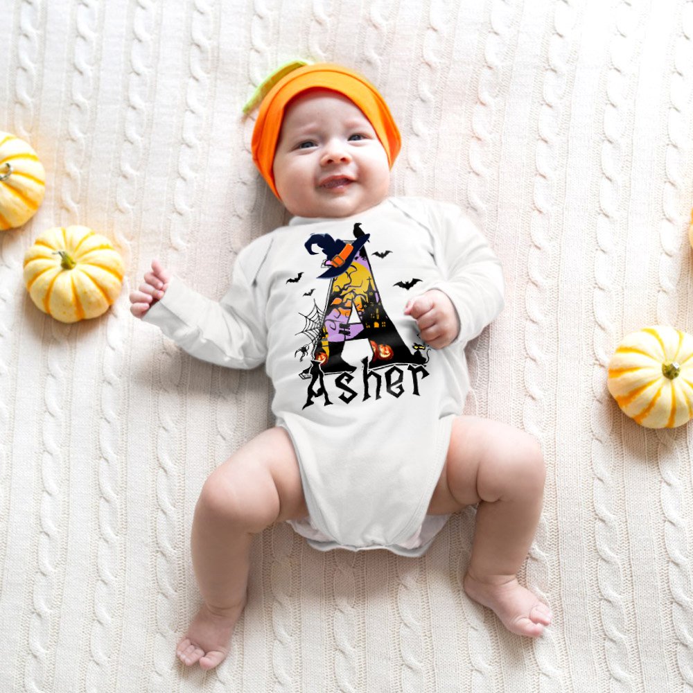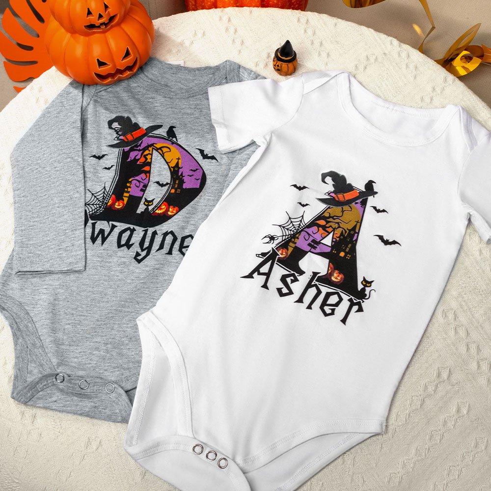 Dit rompertje en T-shirtontwerp zit vol vakantieplezier en creativiteit. Deze kleding is schattig en relevant, met hun initialen van Halloween-elementen zoals cartoon tovenaarshoeden, pompoenpatronen, vleermuizen en spinnenwebben. De persoonlijke naamaanpassingsservice maakt elk stuk uniek en voegt een gevoel van exclusiviteit toe.
