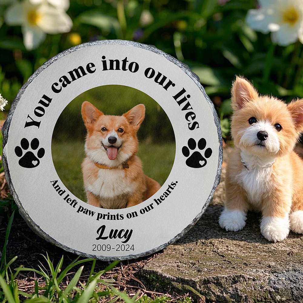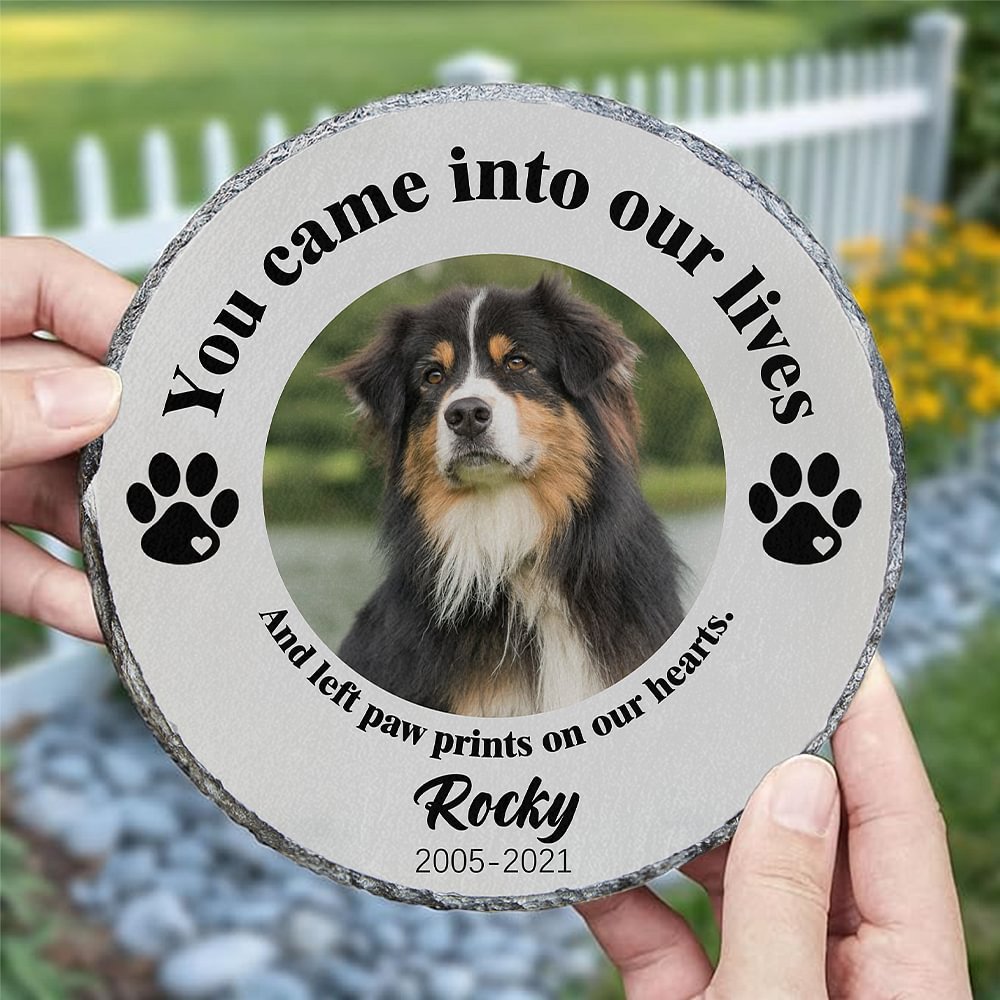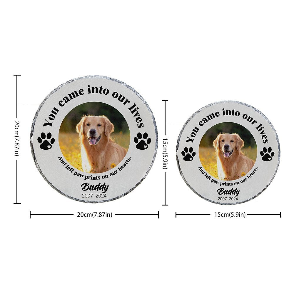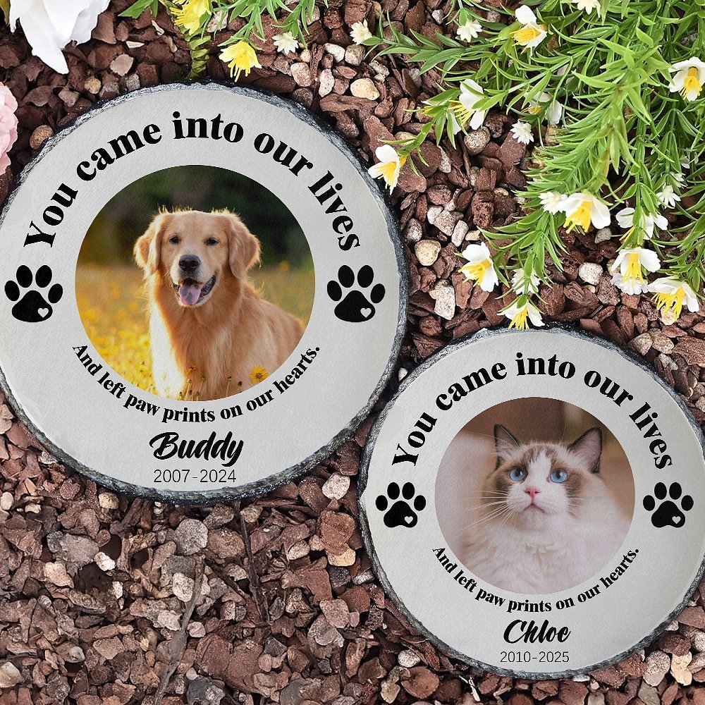 Deze gepersonaliseerde tuinsteen heeft de inscriptie "Je kwam in ons leven en liet pootafdrukken achter op ons hart", waarmee je je gemis voor het verlies van je huisdier laat zien. Je kunt een foto van je huisdier uploaden naar de steen en een pootafdrukontwerp kiezen dat een hond of een kat voorstelt. Daarnaast kun je de naam van je huisdier toevoegen, samen met zijn geboorte- en sterfjaar, zodat je een eeuwig gedenkteken voor je dierbare metgezel creëert.